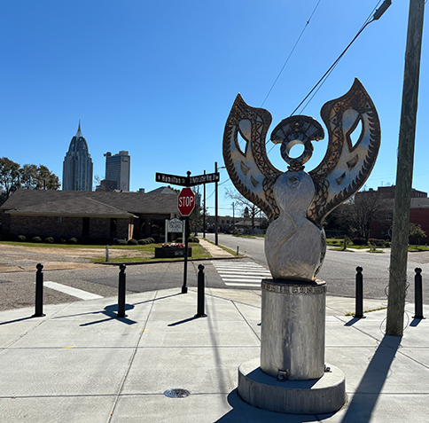 This stainless steel sculpture, created by local artists Charles Smith and Frank Ledbetter, commemorates the men and women of ILA Local 1410. Inspired by African textiles and symbols, it represents the efforts of ILA members to be respected for their labor, to achieve true liberty, and to share their love of life with all people. It was commissioned by the Rotary Club of Mobile and Main Street Mobile.